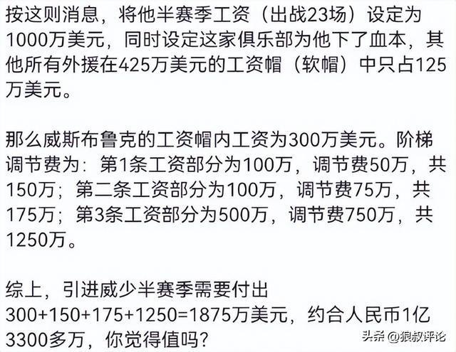 这个消息在国内引发不少争议,CBA工资帽最高只有425万,若是半个赛季就需要支付千万级别美金的合同,威少需要支付人民币过亿的投入,有媒体点评是威少团队放出消息,逼宫尽快确定合同的操作。否则,这种假的离谱的爆料,根本不符合CBA工资帽规则,如今威少和国王顺利完成签约,或许更加进一步印证了有一些媒体帮威少抬价的操作。