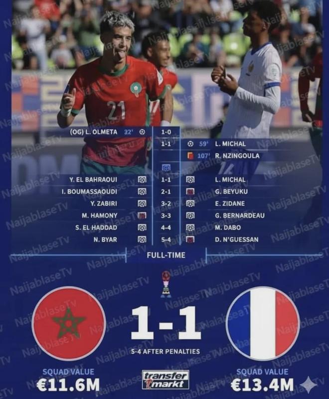 摩洛哥5-4 法国第一场半决赛是由摩洛哥对阵法国,两队在120分钟内战成1-1平手,进入残酷的点球大战。点球大战双方前5轮战成4-4。第6轮,法国队恩盖桑点球被梅斯巴希扑出,摩洛哥队点球5-4取得胜利,晋级U20世界杯决赛!