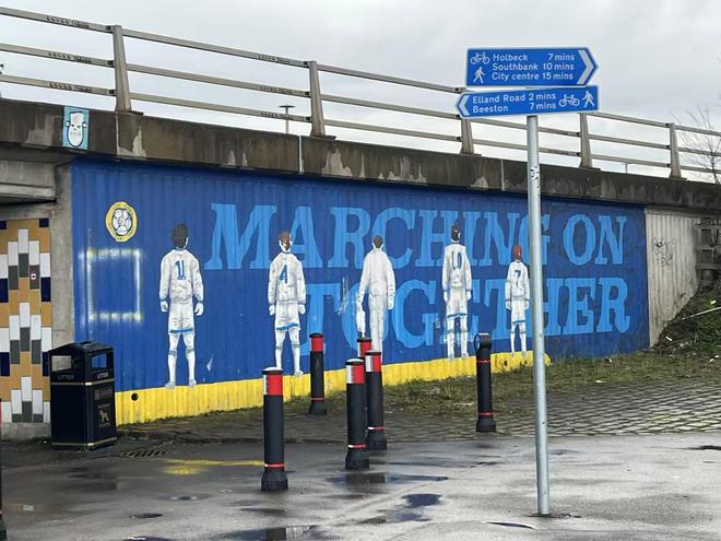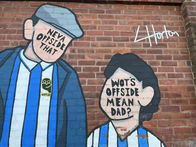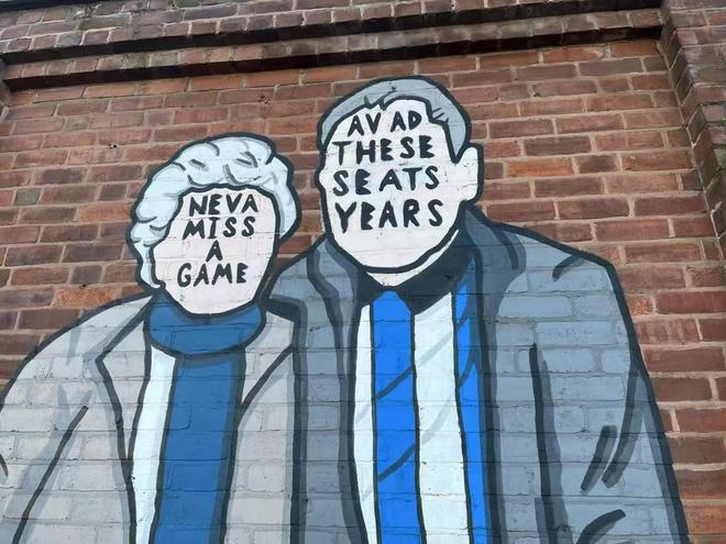 英超球场里终场哨前散场也正是因为交通。尤其对从郊区还远的地方来看晚场球的球迷来说,错过一班去车站的地铁可能意味着露宿街头,因为深夜几乎没有火车。走在路上看到球场距市中心15分钟,不要轻信他。正如上图这个路牌,它说的要么是环法冠军或者博尔特,肯定不是你。看球只有90分钟,唠嗑不止俩小时当每周看球成为一种习惯,距离、交通、时间可能都不是问题。每周和季票坐席身边的bro的一期一会可能更重要。无论你对球队的了解有多少,有没有做功课、看报纸、关注社交媒体、刷懂球帝(强烈建议刷),一路上都可以有聊不完的话题。这些话题很可能不限于足球,球迷之间的距离、足球和生活的边界都在这来去的时时刻刻里消弭。甚至,和你走在同去球场路上,和你戴同样围巾、同款帽子、球衣印同一个号码的老哥可能都没有一张门票,他就是来球场隔壁的酒吧度过一个热血沸腾的下午或晚上。你以为他说的三里屯附近就是工体的方向,没想到他真的只去三里屯。如果携带第一次来观赛的家眷,那更是一个良性mansplaining(“爹味说教”)的大好时机,一切对对方来说可能都是崭新的,包括你,如一个萎靡不振的宅男可能也有激情四射的一面。但友情提示:她让你闭嘴的时候还是记得及时闭嘴。看球是一件可以陪伴一生的兴趣。走在谢周三希尔斯堡球场外的围墙看到这样一副涂鸦,便会理解足球为什么可以是、会是或者真的是生活的一部分?