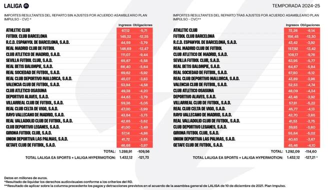 根据西甲联盟官方公布的最终核算数据,2024-25赛季视听版权总收入为12.92亿欧元。在西甲联盟调整后,皇家马德里以约1.5792亿欧元成为收入最高的俱乐部,巴塞罗那以约1.5645亿欧元紧随其后,马德里竞技以约1.0817亿欧元排名第三。这三家俱乐部的收入总和约占联赛此项总收入的35%。西甲俱乐部的具体调整后电视转播权收入如下:皇家马德里:1.5792亿欧元巴塞罗那:1.5645亿欧元马德里竞技:1.0817亿毕尔巴鄂竞技:7226万欧元皇家社会:6780万欧元皇家贝蒂斯:6467万欧元塞维利亚:6395万欧元比利亚雷亚尔:5781万欧元赫罗纳:5564万欧元瓦伦西亚:5253万欧元奥萨苏纳:4809万欧元塞尔塔:4577万欧元赫塔费:4546万欧元马略卡:4389万欧元阿拉维斯:4346万欧元西班牙人:4342万欧元巴列卡诺:4270万欧元巴拉多利德:4153万欧元拉斯帕尔马斯:4063万欧元莱加内斯:3993万欧元