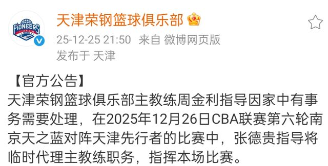 - CBA | 又一位主帅下课天津官宣周金利家中有事缺席第6轮5连败垫底