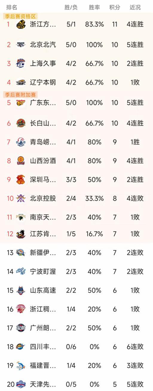 CBA常规赛第6轮结束了4场比赛,最新积分榜如下!