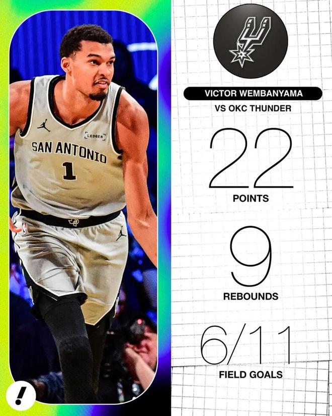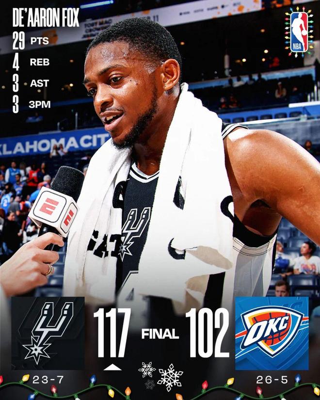 圣诞大战,马刺客场117-102战胜雷霆。是的,这已经是马刺本赛季第三次击败雷霆了,这三场比赛全部发生在过去的半个月时间,而且一场比一场干脆残暴:——两队第一次交手在NBA杯半决赛,那场马刺最多落后16分,文班亚马替补成为奇兵(只打了20分钟,拿了22分9篮板2助攻,正负值+21),马刺111-109险胜雷霆2分