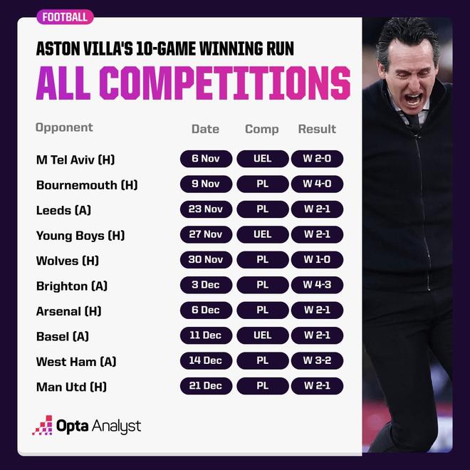 如果客胜切尔西,维拉将追平队史最长11连胜