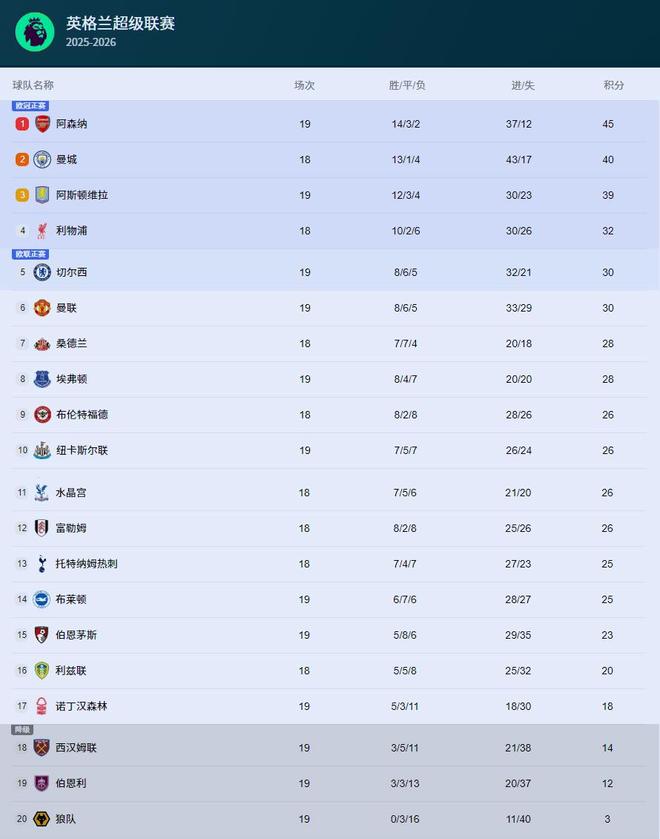 - 英超 | 英超第19轮结束了6场比赛,最新积分榜如下!