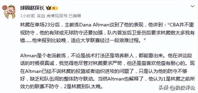 媒体人赵探长发文点评:Altman是个老派教练,不论是战术打法还是培养新人,都能看出来。他在讲这段话的时候很真诚,我觉得他尽管对林葳要求严苛,但还是蛮喜欢他蛮有耐心的。现在Altman已经不说林葳的投篮或者组织进攻的问题了,只是认为他的防守不够好,缺乏和队伍间的整体防守联动。当然Altman也解释了,他认为1是林葳之前所效力的联赛不防守,2是林葳到队太晚。