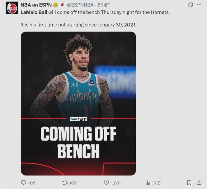 咱们今天要写的并非步行者,而是黄蜂当家球星拉梅洛-鲍尔。此役三球替补出战26分48秒,24投12中,三分15中7,罚球2中2,空砍33分3板8助3抢断3失误,正负值+19全场最高。这是三球自2021年1月30日以来,首次打替补!