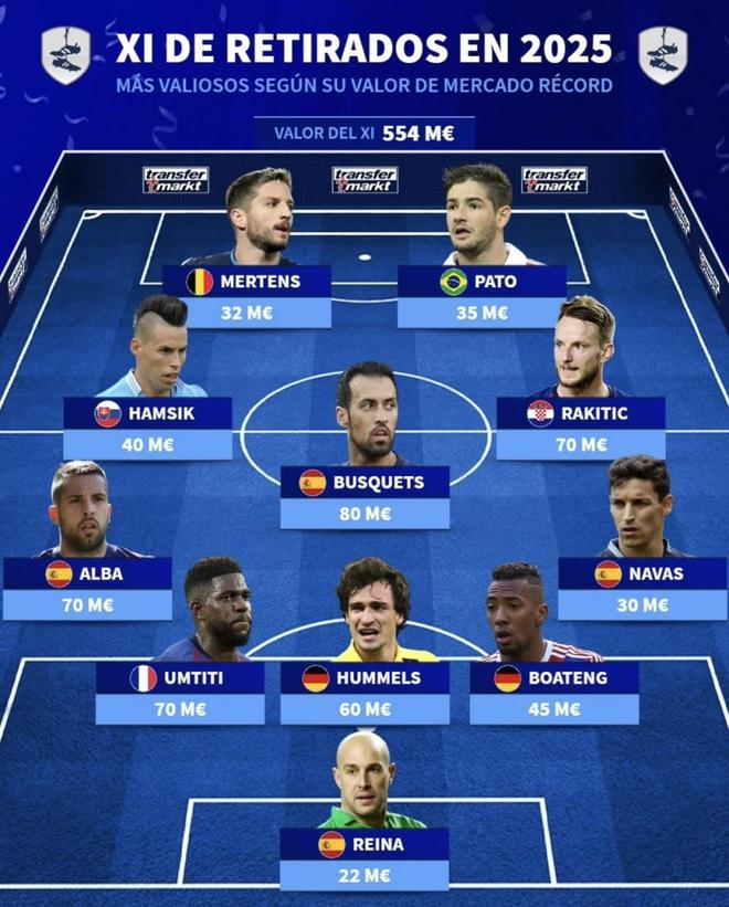 最近德国转会市场发布了《2025退役球员最佳阵容》,雷纳、布斯克茨、拉基蒂奇、阿尔巴这些熟面孔都在名单里。光看配置就知道这套阵容偏技术流:后场能出球,中场能控节奏,边路还能反复起速。那如果把他们都放回各自最能打的巅峰年份,这11个人拼在一起,到底能有多强?数据截至撰文时间(北京时间2026年1月2日)。