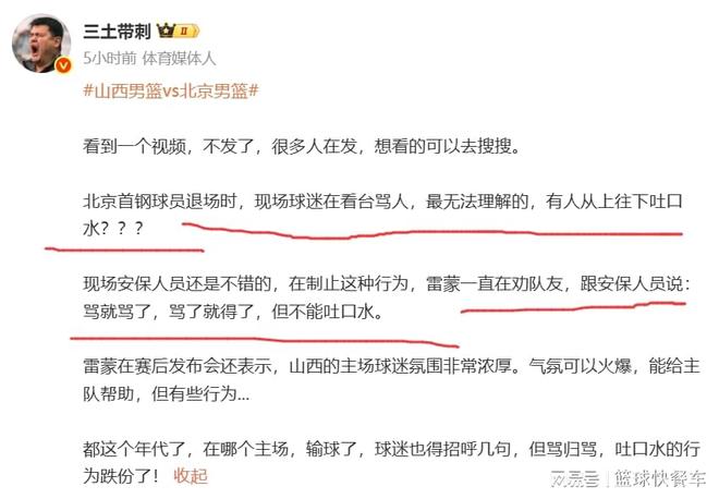 然而,就在山西队输球之后,山西队球迷又闹事了。在北京队离开之际,山西队球迷不仅辱骂了北京队球员,而且,他们竟然还朝着北京队球员吐口水。陈盈俊、雷蒙等人在随后便向现场安保抗议,雷蒙在随后的言语,甚至让人有些心疼。“骂就骂吧,骂了就得了,但不能吐口水。”雷蒙如此说道。很显然,从现场的局面上来看,山西队虽然加强了安保,可依然未能阻挡山西队球迷的“热情”。